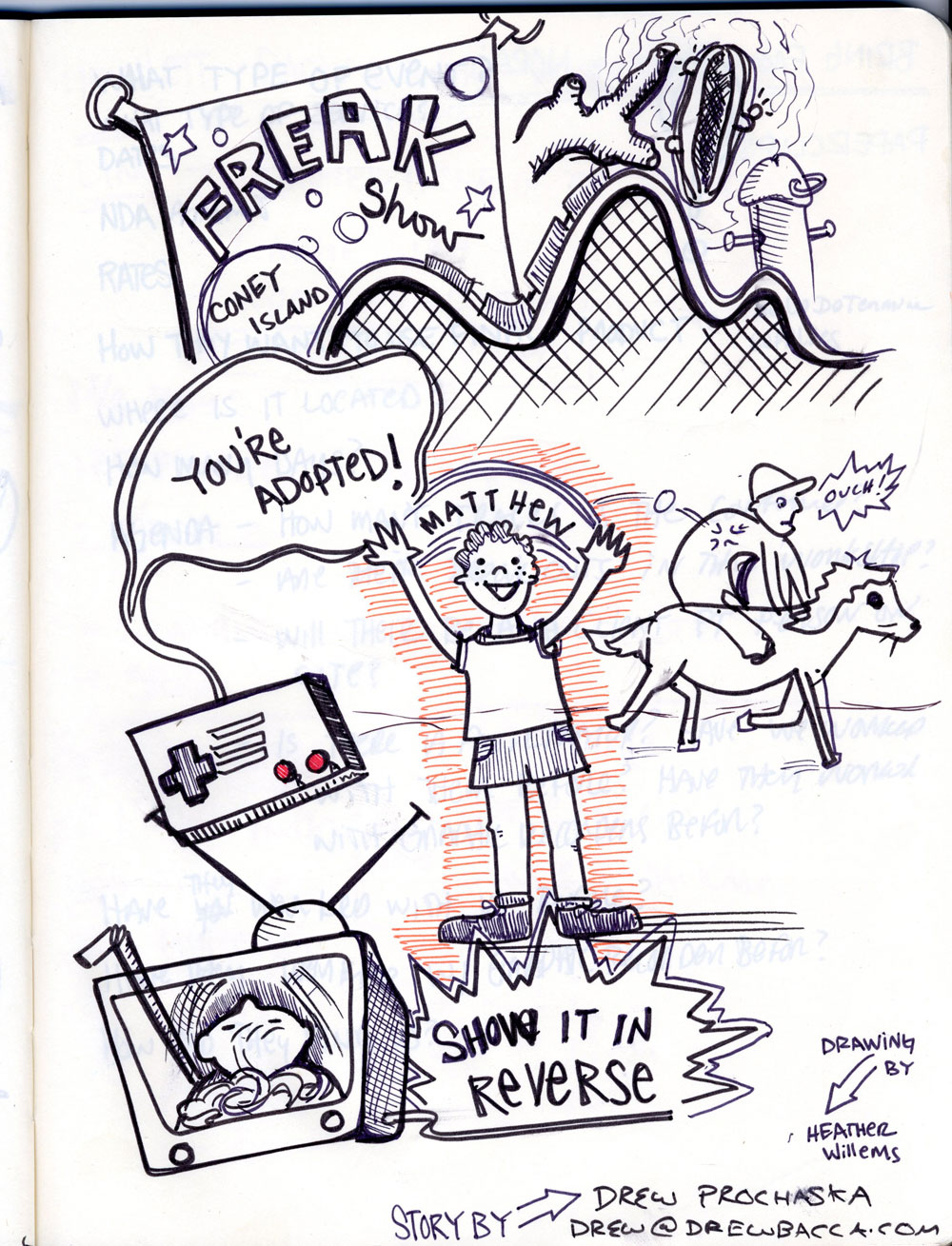 … and then Drew Prochaska tries to make up for 10 years of being a rotten sibling when his parents entrust him with his little brother for the weekend. He takes the kid to Coney Island, where they can’t seem to escape perversion around every corner.